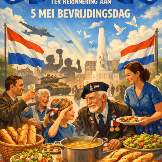 Onder het genot van een drankje nuttigt u een heerlijke rijk gevulde ‘vrijheidssoep’ en de maaltijd wordt afgesloten met een smakelijk toetje. Bij de maaltijd serveren wij nog een 2-tal drankjes.